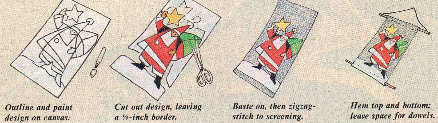 Heralding the holidays, these colorful banners greet visitors at the street, by the front door, or in the house. These contemporary versions of medieval gonfalons have a banner-shaped backing of weatherproof fiber-glass screening ordinarily used in doors and windows. Our banners show a waving Santa, a Nutcracker rat, and a persimmon branch, but you can copy and enlarge any favorite image or printed message. Because the screening is almost transparent, the image seems to float in air.