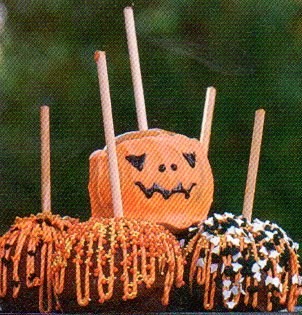 DIP each apple into chocolate; let dry. MELT vanilla bark coating in a small saucepan over low heat; stir in orange food coloring.