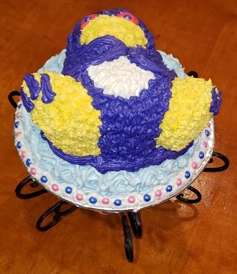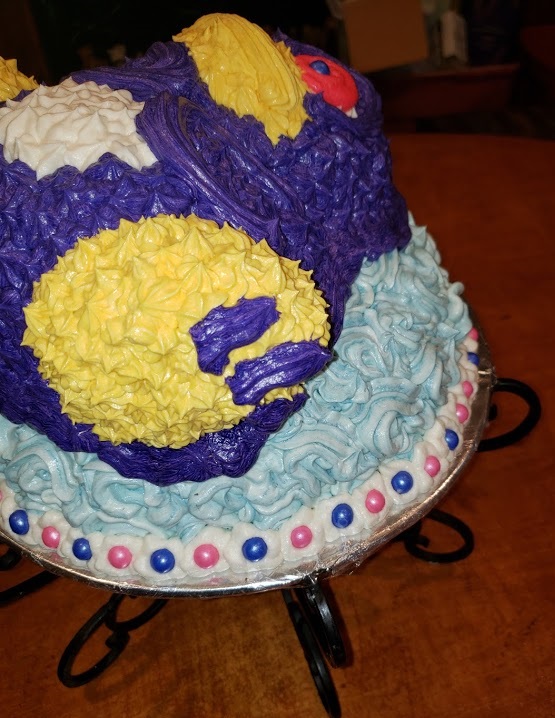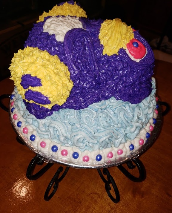 I then used yellow icing and a wide star tip to cover the feet and beak. I mention wide because I would uses a smaller tip next time. I iced the white belly. I iced the purple (which came out really darker then I wanted but made the mistake of tinting too much icing and wasn’t going to remake it). I then added the eyes which again came out darker than planned. I piped a border around the bottom of ice berg and border around the area where the penguin joined the ice berg. I added candies to the bottom border and to the eyes. Used a nice little cake decorating set I found that has bags and tips and everything you need to decorate this cake.