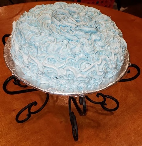 I used a cake stand I had already had and covered it with foil. I added a scoop of icing on top to help the cake not slide. I added the one layer and then covered the top with a thick layer of buttercream icing. I put the other layer on top of that and pushed down slightly. I then carved the cake to be a half dome but with the top having a bit of a more flattened side so the penguin could sit on top. I iced this using white buttercream icing with an icing bag that I wiped several variations of blue onto the inside of the bag so that when the icing came out the white icing has blue hues to it. I didn’t want it to be all white or all blue. Icebergs have a natural blue and sometimes green hue to them. It came out really nice.