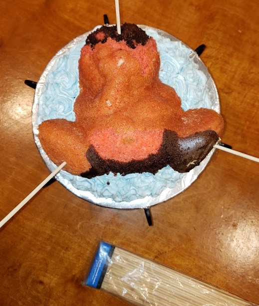 I then made the teddy bear cake to directions. I carved off the ears and a bit of the snout. I also cut down the back so it had a flat surface so it would rest evenly on top of the iceberg. I placed the penguin cake down on top of the already iced ice berg. I immediately added thin wooden dowels through the feet, arms, head and belly. I pushed them all the way to the cake board. I then trimmed them to the level with the cake.