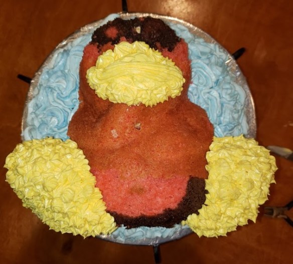 I found a website that shows different cakes made from the Wilton teddy bear stand up pan. I had access to one of these and decided it was going to work. With a little cutting of the cake it could work – I hoped!