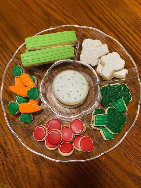 How much fun would it be to watch peoples faces when they come across this veggie platter when visiting you for the holidays. Of course, they aren’t veggies, but sugar cookies made to look like they are veggies. Use cookie cutters to cut cookies and a sugar cookie icing recipe for the icing. Even the middle cookie that looks like ranch dip looks sweet.