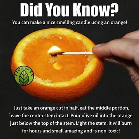 This is pretty cool. Would be neat for a table, in a small hurricane lampshade or a party. The smell of using an orange and good quality olive oil will leave a warm home smell in the air.