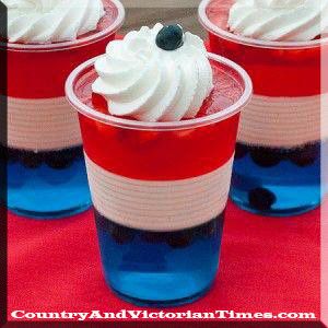 946507_658314530865305_647629302_nUse disposable clear cups and make blue jello – pour to almost one-third level and chill. Repeat with a cool whip layer and then a red layer of jello. Chill. You can add fresh (wash and dry before using) in the blue layer before it has thickened completely. Before serving add a whipped topping and one blueberry to the top.