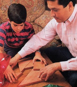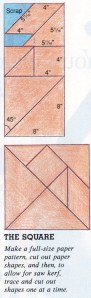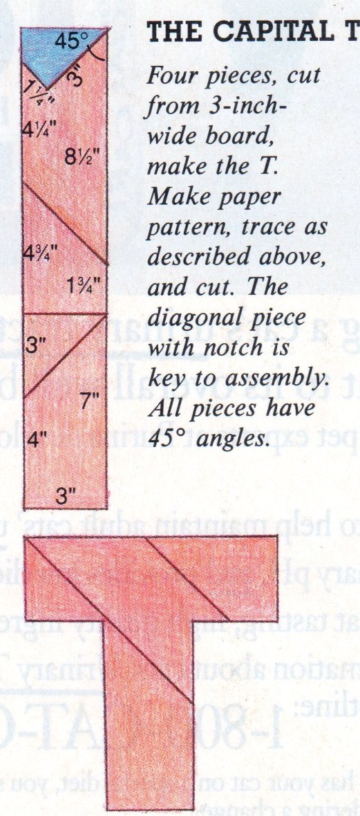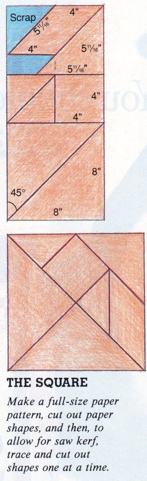 TWO CLASSIC PUZZLES challenge you to arrange their geometric parts into a square or a capital T. They look easy to make but require careful planning and straight and accurate cuts.