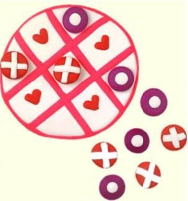 - Make 5 balls with Red Hot Red and 5 balls with Violet. The balls should be as wide as a dime. Flatten the balls into playing pieces. Use White to decorate the Red Hot Red pieces with X’s. Put a tiny White ball in the center of each Violet piece to make O’s.