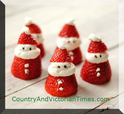 Another very easy treat. Cut tops off of strawberries. Toss these and then cut the tip off but keep these. Pipe whipped cream and place cap back on top of this. Place two dots of whipped cream to make buttons. Then top the cap with whipped cream to make a puff on Santa’s hat. With the tip of a toothpick touch the whipped cream with a dot of black food coloring. Serve.