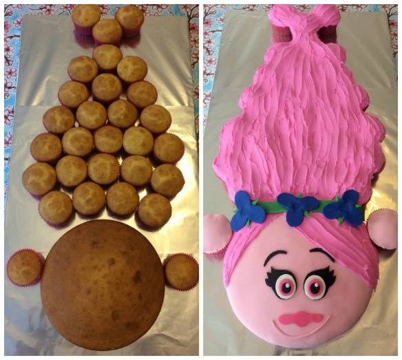 What an awesome idea for those who have a little one who absolutely loves Poppy from the movie Trolls. Lay cupcakes as shown. A 8 inch diameter cake pan was used for the face. Here fondant is used on two cupcakes (ears) and for the 8 inch diameter cake used for the face. I am not a fondant lover so I would use buttercream icing for the face, eyes, nose, band and flowers. The hair was done with buttercream. Makes an awesome cake and easy to divide up for all the little (and big) kids at the party.