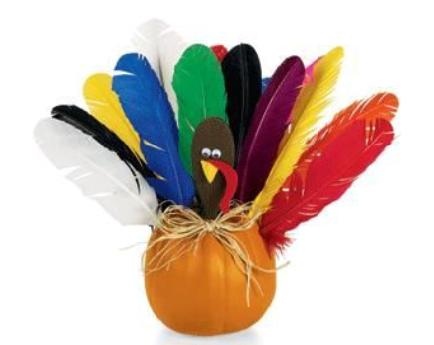 2. Adults Only: use end of scissors to make holes in the pumpkin for feathers. Then make a hole for the spoon in front of feather holes.
