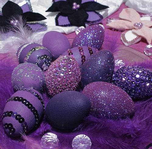 I am always amazed at how creative someone can decorate Easter eggs! These beauties were all dyes to start with of the artists favorite color ‘purple’. This gave a base color to work with. The artist used the same dye in different amounts of dye to bring out different shades of the color. Some went on even further to be painted. You can see glitter and sequins being used here. But what else could be used to decorate eggs. This would be a perfect time to bring out the little craft left overs and see just how creative you can be. If you are using solvents on these it would be best not to eat them if you are making on hard boiled eggs for health safety.