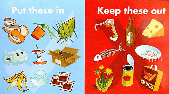 meat, fish, poultry, cheese, oily foods, butter, other animal products and never put in yard trimmings that are weeds or anything with roots
