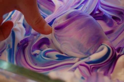 181014_457707377635741_1339838334_nMix food dye with 1 cup of shaving cream to make swirls etc. Roll egg into shaving cream and let sit for about an hour. Wash under room temperature water. Egg with have a varying degree of color shading with swirls. I would not recommend eating these eggs because of the chemicals from the shaving cream.