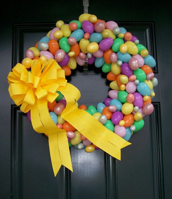 This would make an awesome decoration that you can even make with your child. With all of the varieties of these plastic Easter eggs available this could go into any direction: Mix and match, use all glitter, use a theme, all animal designs. Start with a Styrofoam wreath of your choosing. Take a ribbon or thin wire and wrap it around the top to make a loop to use as a hanger.Wrap the wreath in a cheap fabric (use scrap or buy a festive Easter color or print) and hot glue and pin this together. Use hot glue to attach eggs – starting with the largest and going smaller to fill in the gaps. You could add a little Easter basket grass as you go if you wish. Add a festive bow to complete.