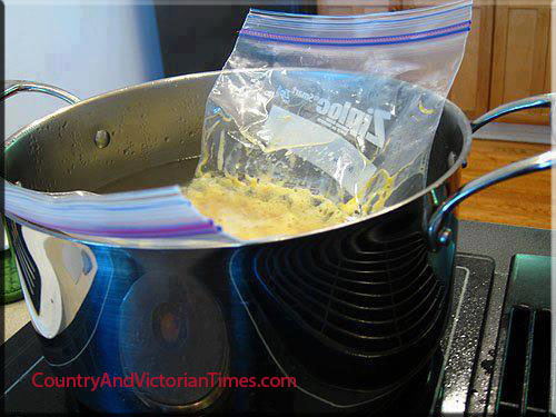 Place the bags into rolling, boiling water for exactly 13 minutes. (We suspect that if you only make fewer at a time you might not need to cook them for that long.)