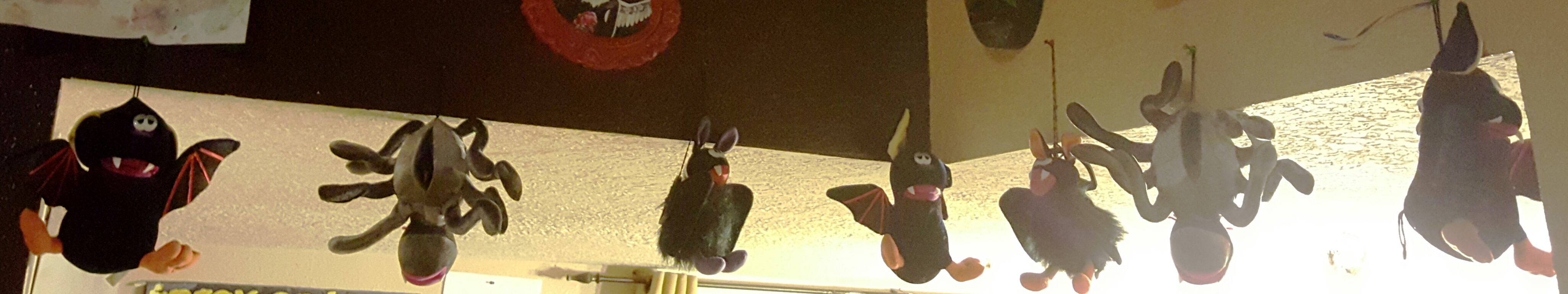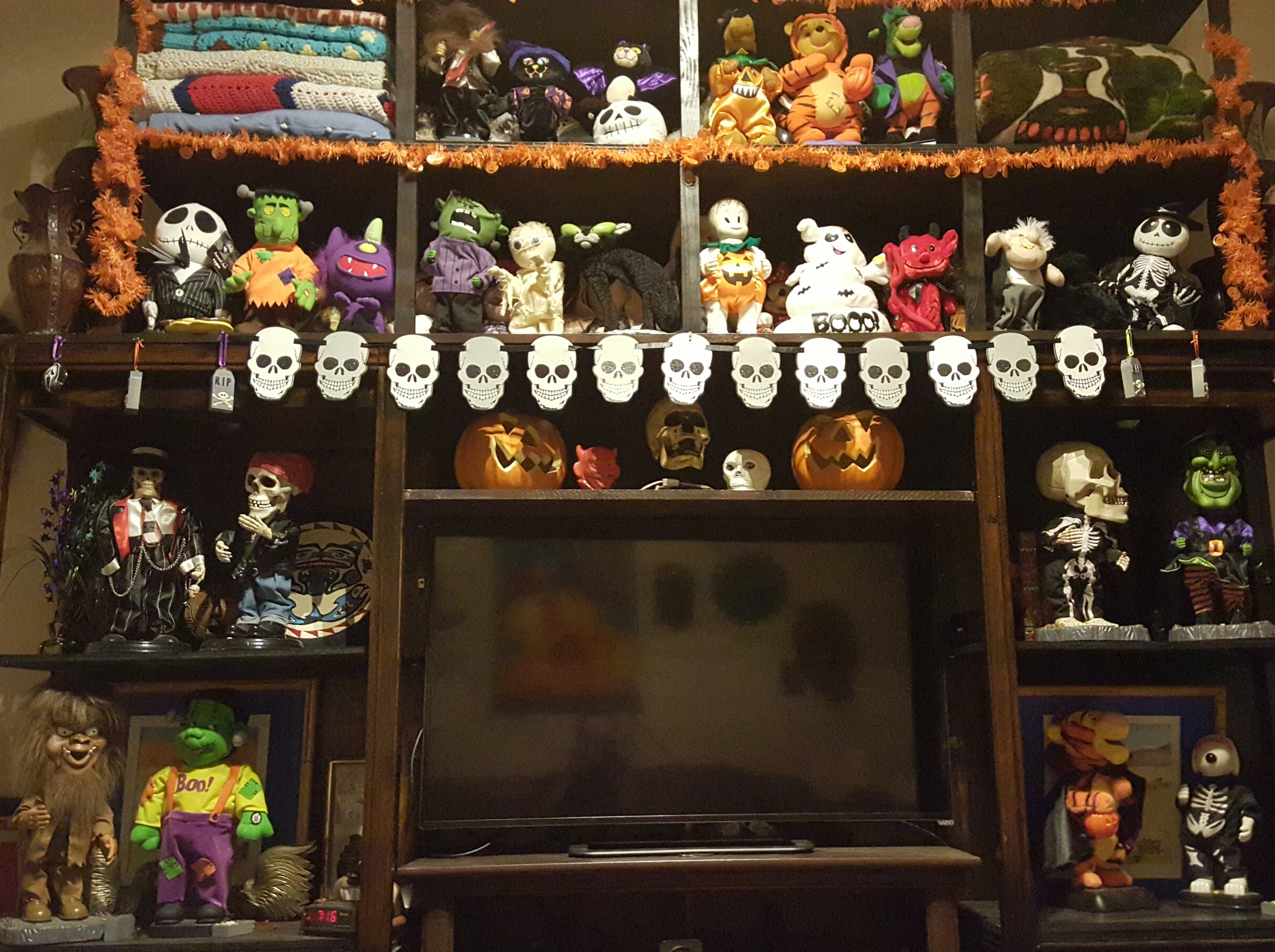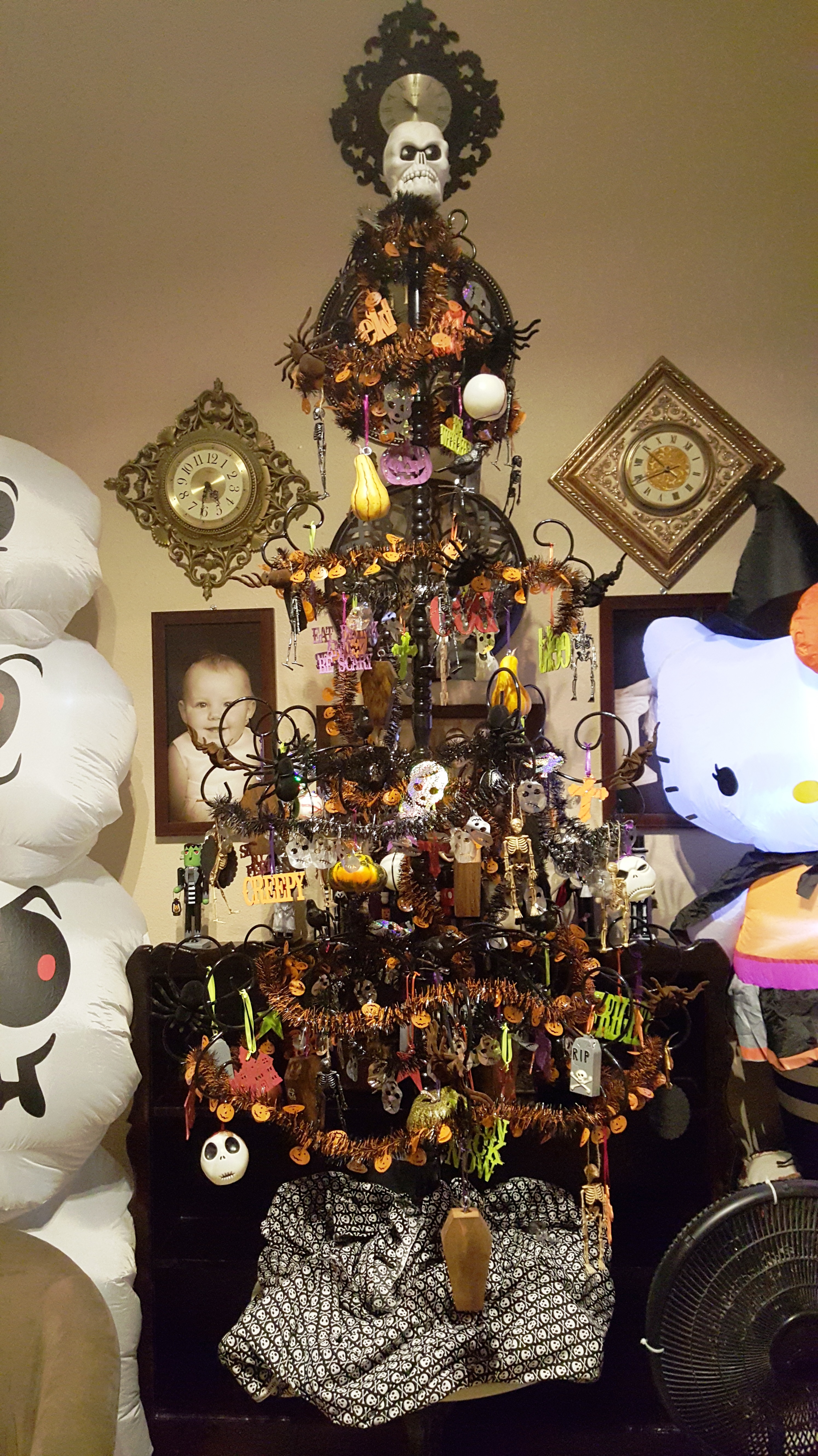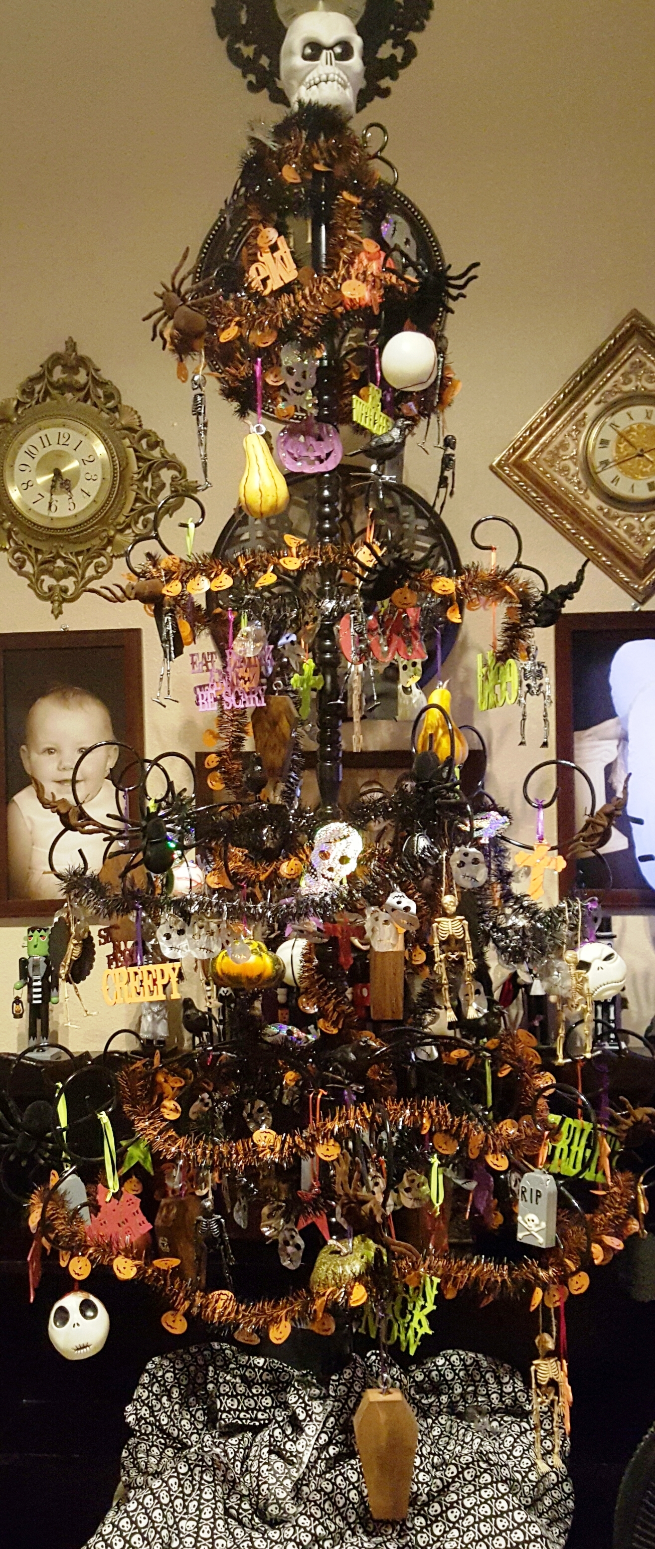 The tree is new (well not really new as I have had it for about a year and haven’t used it since I got it on after holiday sales). This is an all wrought iron design about eight foot tall. It makes for an interesting tree and now that I have had it up I want the white version of it for Easter or other holiday. Ornaments range from wooden coffins that open, skulls, bats, spiders, crows, pumpkins, skeletons, gravestones. Most of these I had acquired over the years – old light strings with the push on figures were converted to ornaments. Skeleton garlands were cut down (bought at dollar store) and made into ornaments, clip on crows are light activated and other odds and ends. Then we put on Halloween garlands and added a strobe light to the bottom shining up which gives awesome designs on our two floor high ceiling.