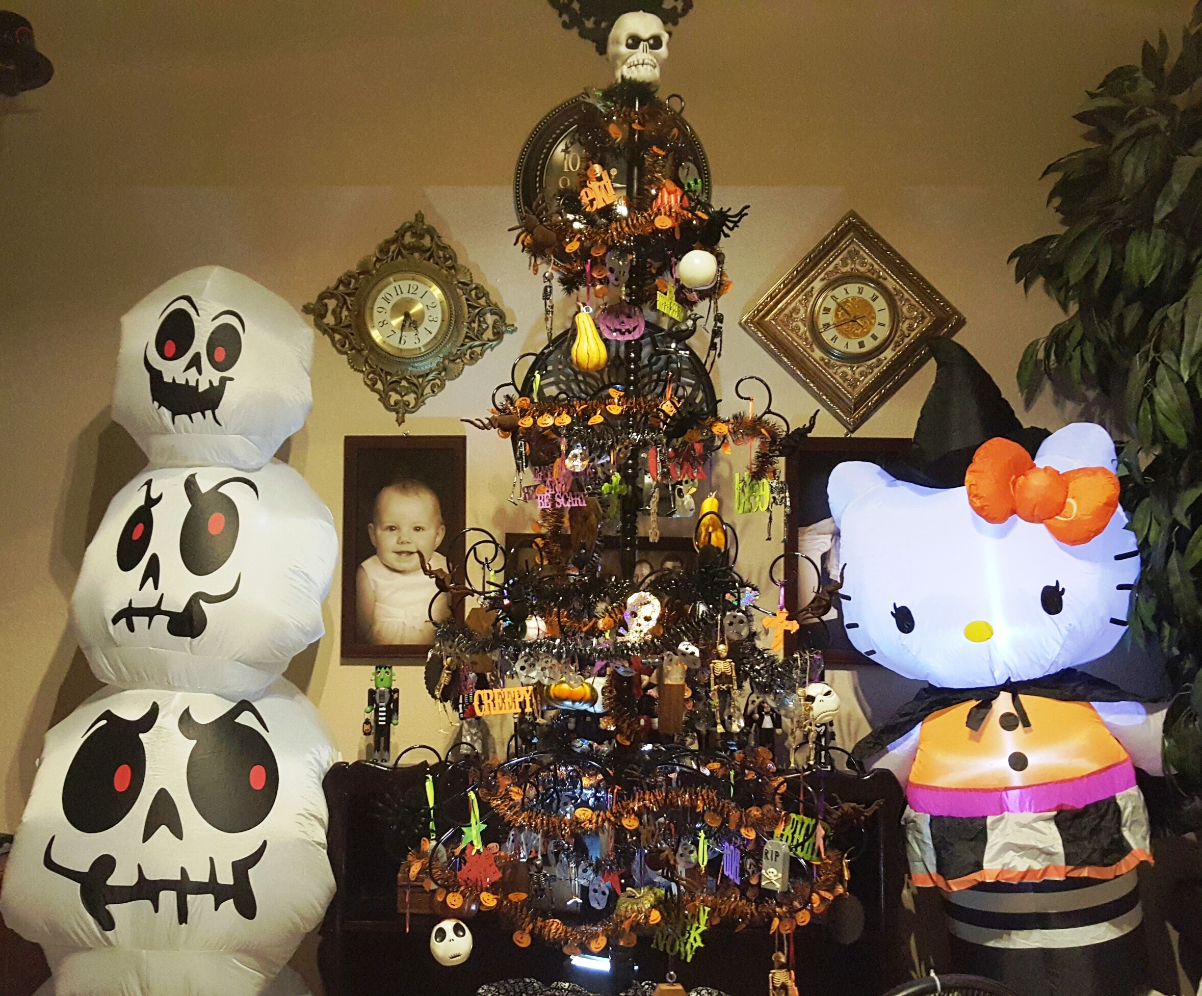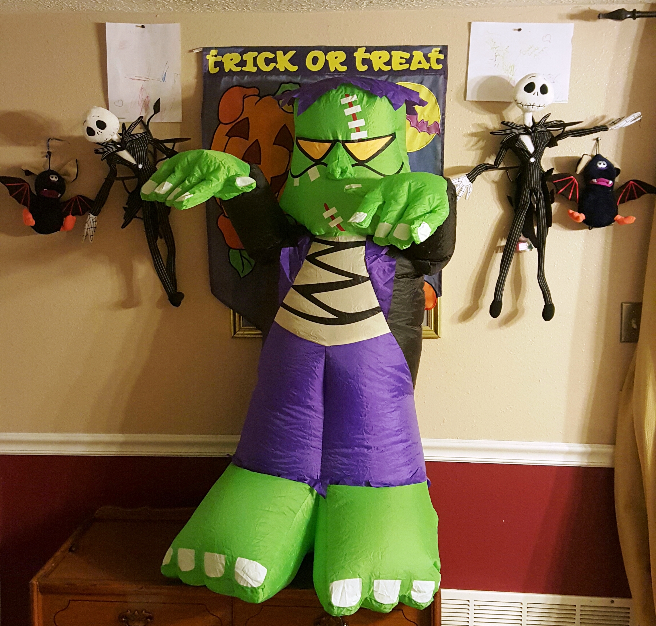 I really enjoy the aspect of blow ups and have them now for almost any holiday. I get ones that are mainly upright and around four feet so they can sit on top of the entertainment unit or other service with little interruption to things in our everyday use. Up his year I have my very first blow up Mr. Frankenstein. I also started out with the eight foot stacked skull and a pumpkin with ghosts pouring out – but my little one got scarred of it and we had to get something she could relate to more so Hello Kitty vampire is in its place.