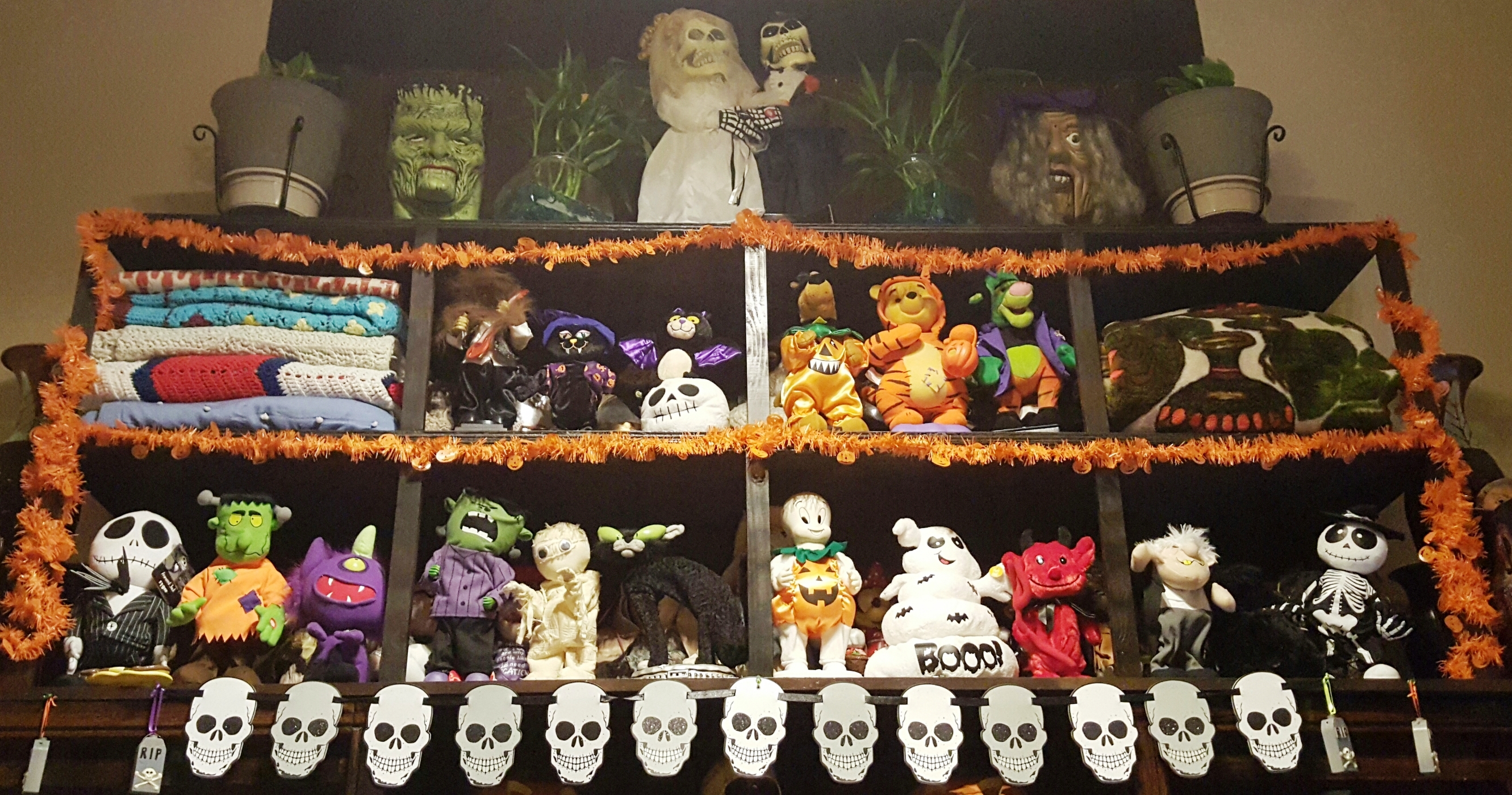 I always enjoy this time of year – in close succession I can decorate for Halloween then Thanksgiving and right on to Christmas and then even a short time to Easter. I grew up with a Mom who left no corner of the home not touched by whatever holiday was coming up. I want to pass this down to my Daughter Aurora – I want her to have these wonderful memories of the holidays surrounded with fantastical creatures from ghosts, Santa to pilgrims, turkeys and the Easter Bunny along with everything in between.I didn’t get it all put up this year (only two thirds) as having an eighteen month puts challenges up for decorating since she always wants to touch and pull.