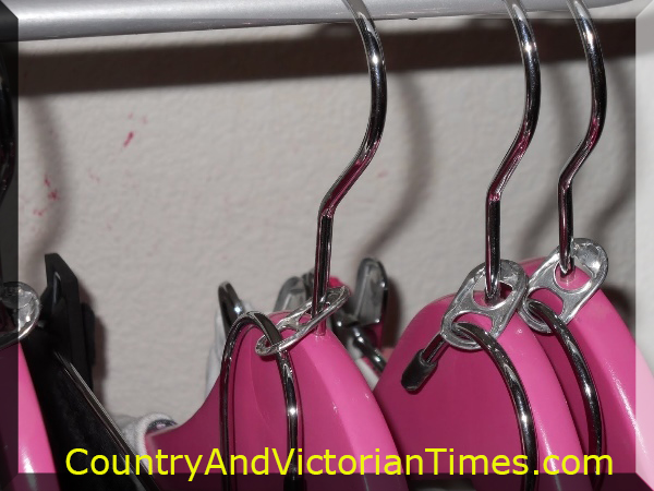 Add extra space in your closet by adding pop tops to your closet by adding pop can tops to your hangers. You get more room because hangers take up a lot of space by themselves and staggering them downwards eliminates the need for their space of one hanger next to another. Don’t stop with just one – you potentially could do this to three to five hangers hanging down from the original. This would be a great space saver for clothes out of season.