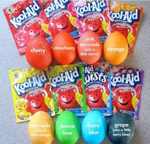 SPOON KOOL-AID mixtures, 1 at a time, over wet eggs to create tie-dye patterns. Repeat with remaining eggs.