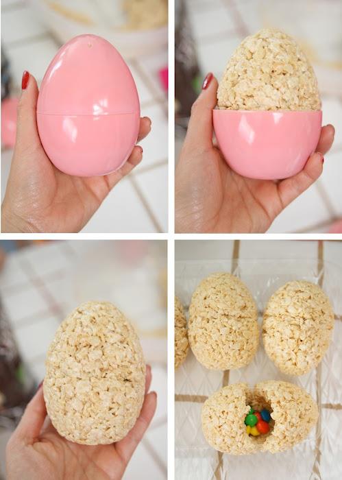 This is a great little treat to make for Easter and you can even get your kiddies in on this one. Make the recipe as usual. Coat the inside of several plastic eggs with butter to prevent sticking. Push a small amount into each side of the egg making sure to cover the inside completely. Level with your fingers as close as you can. Now here you have an option – put the jelly beans inside now (and they may get stuck) or let the 2 halves dry and then put the jelly beans or other surprise inside. If you let it dry you need to use melted chocolate or gently heat the flat area where the egg halves need to attach in a pan and quickly place surprise inside and seal to other side.