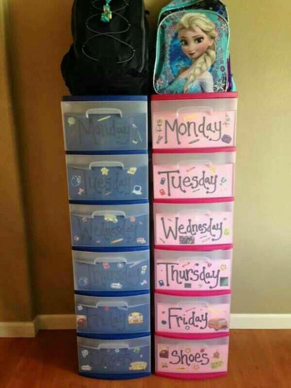 I hate school mornings, Grumpy kids – Grumpy me! Arghhhh! So ideas to simplify the mornings are always good. Here is an idea I found on the internet I wanted to share. Each child had 2 sets of three drawers (like pictured – around 12.50 per unit) and stacked on each other. Monday, Tuesday, Wednesday, Thursday and Friday were written on paper and slipped on the inside of each drawer front. Each drawer had an outfit folded and ready to go. If paperwork like permission slips or something important had to be turned in on a particular day that also would go in the drawer. Their book bag packed each nigh goes on top of their respective drawer system.. This leaves sleepy heads no choices because they already are made. You can place these in a mudroom or in their own rooms out of the way. It just helps make the mornings a bit more quiet and much less panicky….. which is good if I have yet to have my coffee.