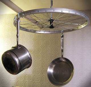 What a great way to recycle an old bike tire. Holes are already along the sides to insert hooks into or over that can be purchased at any hardware store along with simple chains to hang. Pictured it is hung by a rod and hook system but chains are easier to attach. Make sure the hook that this is all attached to is deeply embedded into a rafter to avoid a terrible accident. Use this for lighter weight pans or use as a utensil hanger. If you want to use this for heavier pots and pans remove spokes and cut a 1″ thick piece of wood the diameter of the rim (use the rim as a template) stain or paint then polyurethane and attach to rim. This will give a much stronger rack that you can hang heavier items on. I think this look great…. can anyone else come up with another usage for an old bike rim? If you can share in the comments: