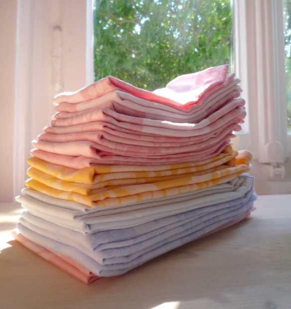 Cut bed sheets into 12″ by 12″ squares. Hem around the edge. You can get a lot of napkins out of one sheet – enough for each guest for each course – and an extra for those who always seem to need one. Since your bedsheets are usually something that you have picked out for the pattern, color or design it is something that you might love to have at your dinner table.