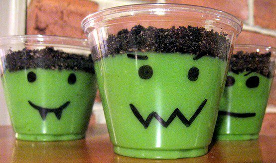Mix 1/2 cup of vanilla yogurt with food coloring (can be any number of colors). In a small plastic cup with sharpie marker draw a monsters face. Put 1/2 cup of tinted in the bottom of cup. Top with crushed Oreos or any type of cookies. This could also be done with ice cream or sorbet and frozen and ready for a snack when your kids are done trick-or-treating while you are going through the candy.