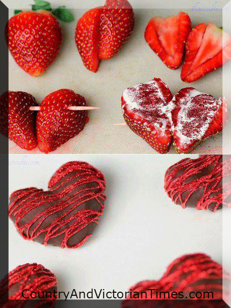 A sinful treat that is so very easy to create. Slice strawberry in half and dip all cut sides in sugar. This will prevent early spoiling of the strawberry. Place cut sides of each strawberry down so that it creates a heart shape. Push a toothpick through the sides to give you a solid heart form that won’t move. Melt chocolate chip (of your favorite type) in a slow cooker on low. Use tongs and dip the entire strawberry into the chocolate. Place on wax paper to harden. Then drizzle colored icing or a different type of chocolate across and immediately sprinkle sugar or colored sugar or sprinkles or edible glitter on top. Tap off excess. Enjoy!