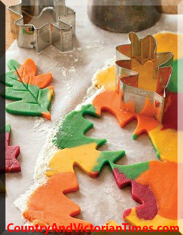So this is done so much easier than you would actually think. The picture above is done with a sugar cookie recipe – so use your favorite or you can even use store bought in a pinch. Allow dough to go to room temperature so it is easy to work with. As shown above the dough was divided into four equal parts (green, burgundy, orange, yellow). Use food coloring (paste or powder – do not use liquid it will change the recipe too much) and color each separated chunk of dough with a different color. Take chunks of dough off of each separated color and put on parchment paper covered counter with flour. Push down and put different colored chunk next to it until you get a nice array of colors. Use rolling pin and make cookies the thickness you desire. push cookie cutters down and make cookie shapes. Squeeze remaining dough together and roll out. The more you roll the more the colors will me mottled but thos can be a sweet treat just for you.