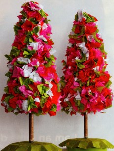 Cut tissue paper into 2-inch squares and gently crumple. Starting at the top of a Styrofoam topiary form, attach each piece with Styrofoam glue. Working around the form, affix the pieces close together, mixing up the colors