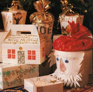 Utilitarian boxes boxes are hardly glamorous wrapping I materials, but try thinking of them as blank canvases for artful holiday collages. With color, glued-on material, handwritten messages—and imagination—you can transform them into personalized packages for gifts. It’s also a way to involve junior members of your family in the holiday preparations.