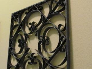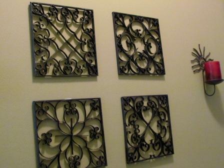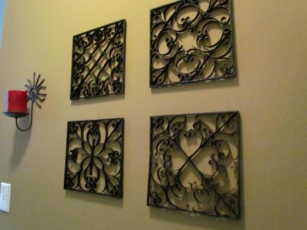 Isn’t this a beautiful bold statement for a homes entry or door. The photo shows a purchased set designed to be hooked together. You could do this with ribbon attached to the wall and frames hung over ribbon to go down your wall just as easy – and cheaper. The design over the door is a wrought iron piece – this could be old spray painted black or left rustic – or find one brand new at places like Michael’s or Hobby Lobby.